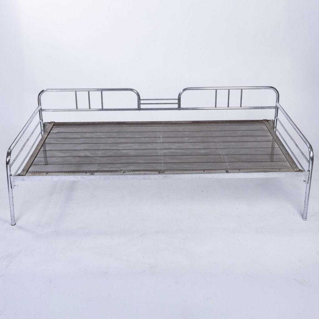 Kovová kostra pohovky z trubkové chromované oceli, typická pro lehké funkcionalistické konstrukce s důrazem na čisté linie a industriální eleganci. Rám je stabilní, s původní chromovou povrchovou úpravou. Stav odpovídá stáří kusu, s částečnou absencí některých původních šroubů.