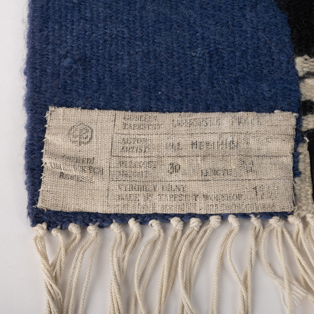 Půvabný vlněný gobelín s motivem ptáčka vyrobený německou společností Bayer Leverkusen pravděpodobně v 70. letech. Tkaná tapiserie je uchycena na dřevěném závěsu a spodní lem zdobí třásně.