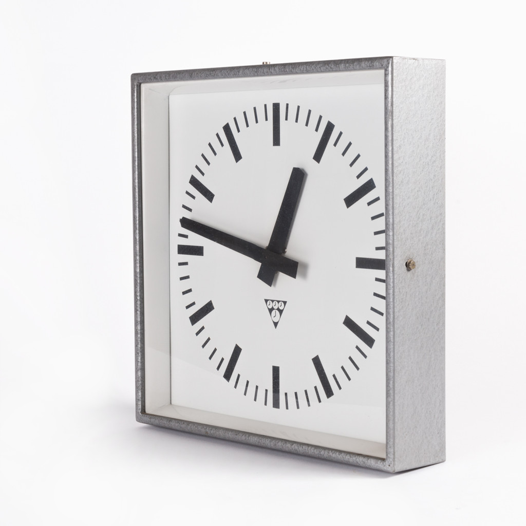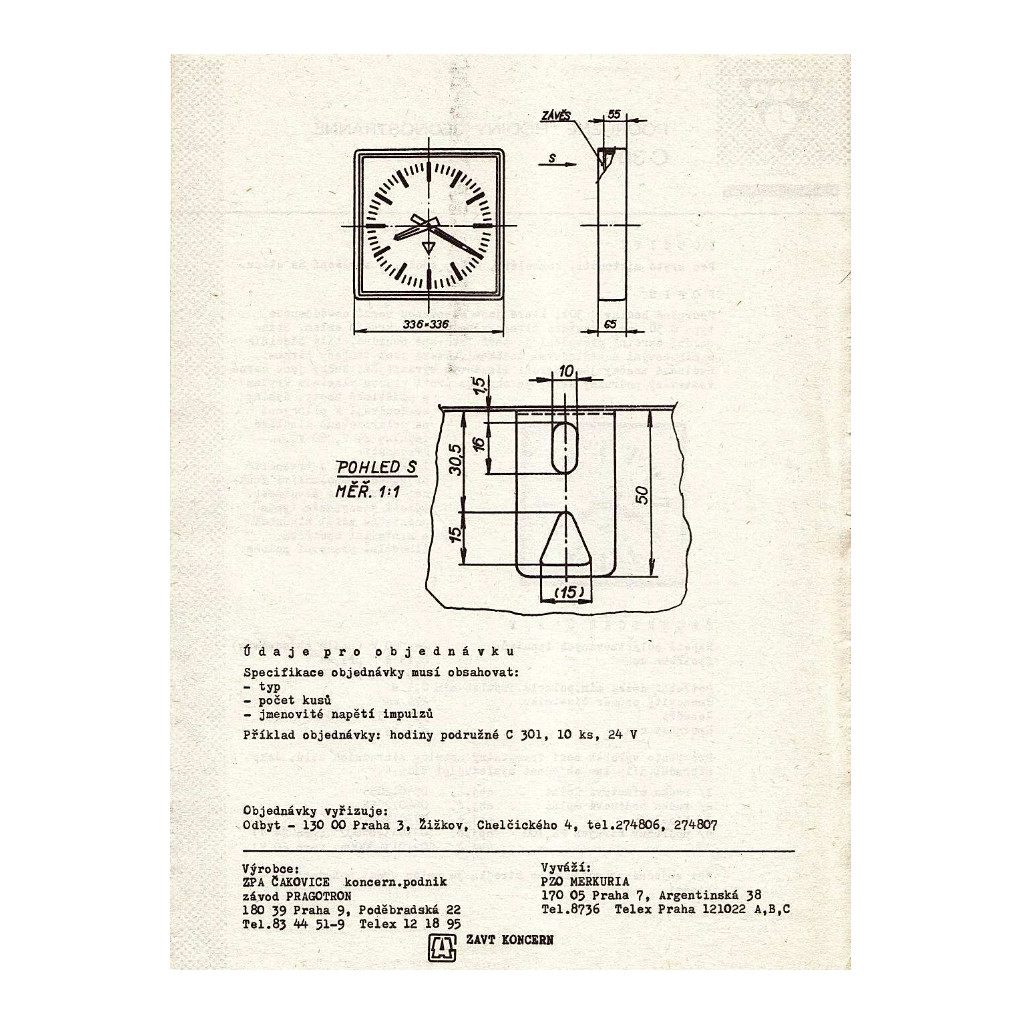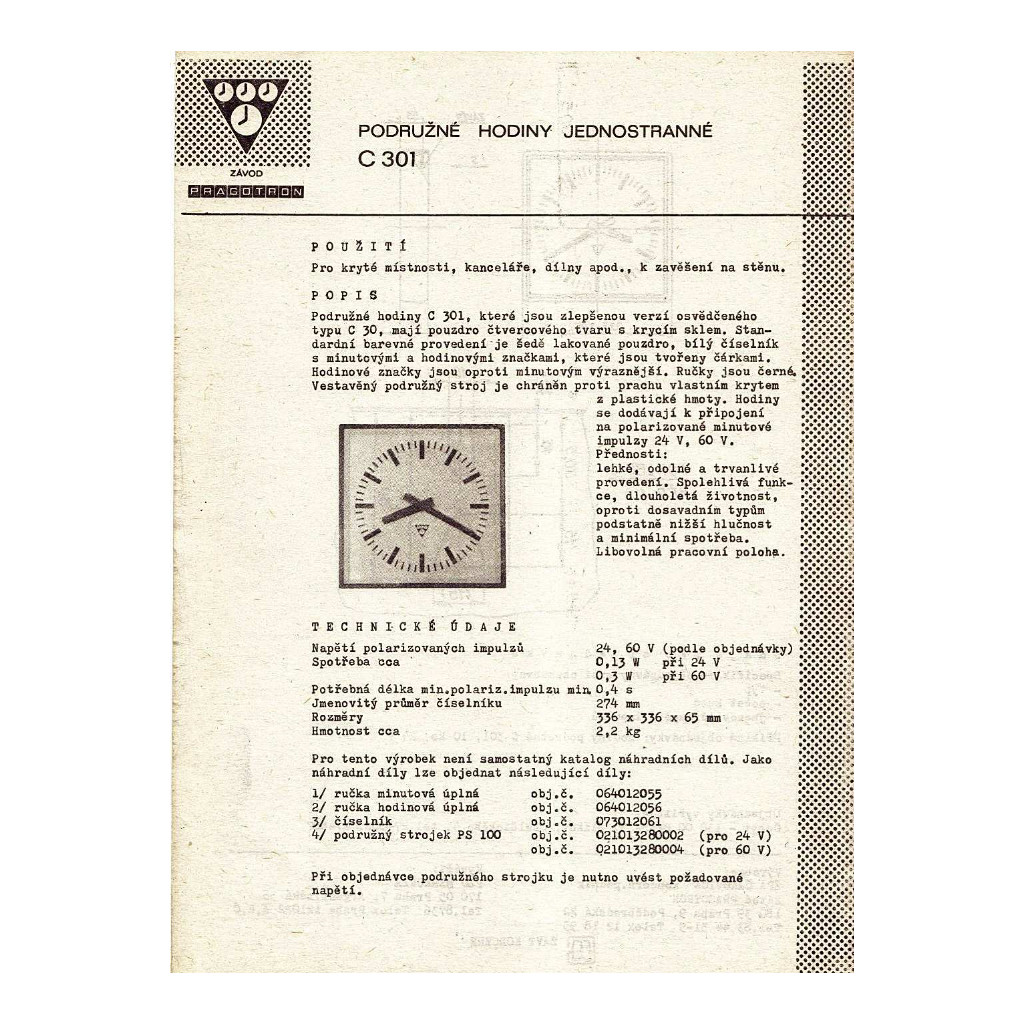 Původní průmyslové nástěnné hodiny Pragotron typu C 301 z 80. let. Hodiny jsou vybaveny ciferníkem s jednoduchým designem chráněným sklem. Rám hodin je zhotoven z plechu stříbrošedé barvy v původním stavu s patinou. Pokud chcete rám nově natřít kladívkovou barvou, tak nám prosím dejte vědět do poznámky při objednávce. Hodiny jsou přestavěné na bateriový strojek napájený 1 x AA baterií.