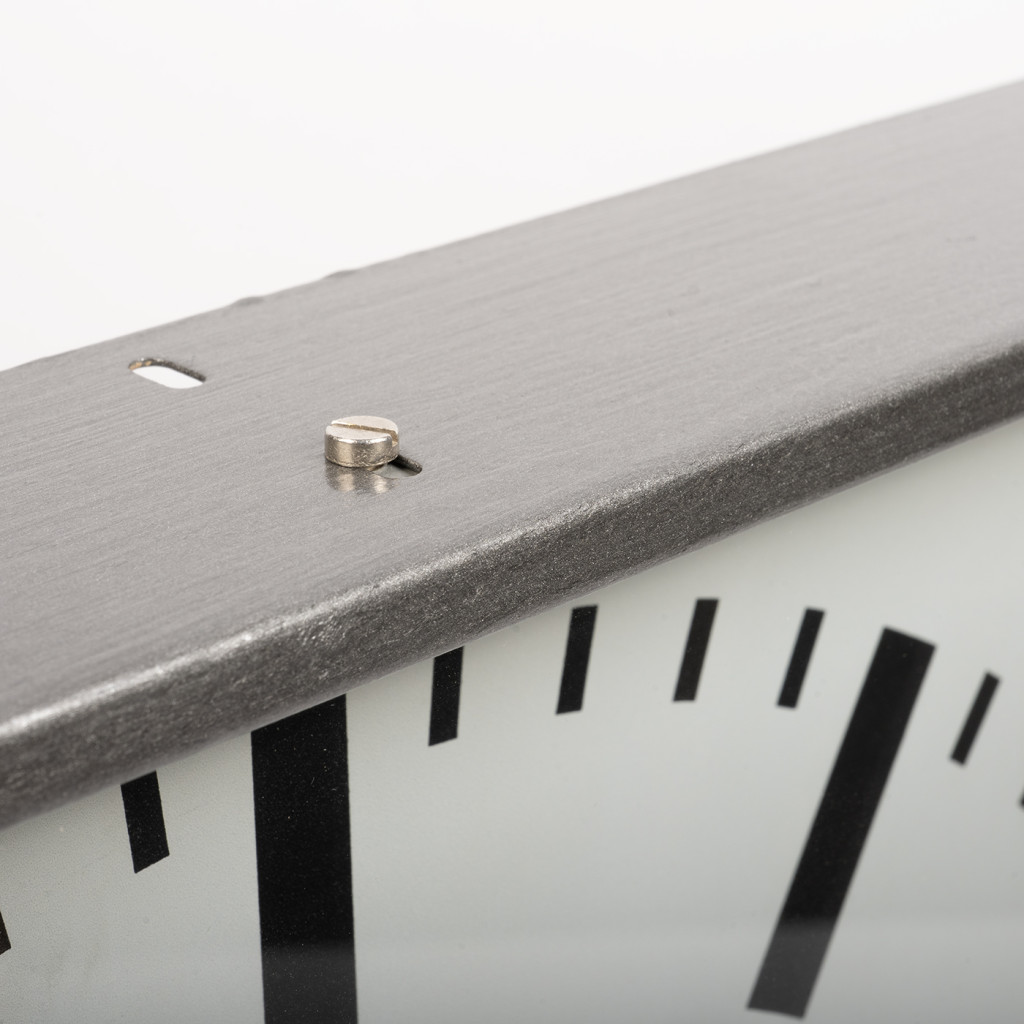 Rám hodin je z ocelového plechu natřeného šedou kladívkovou barvou.