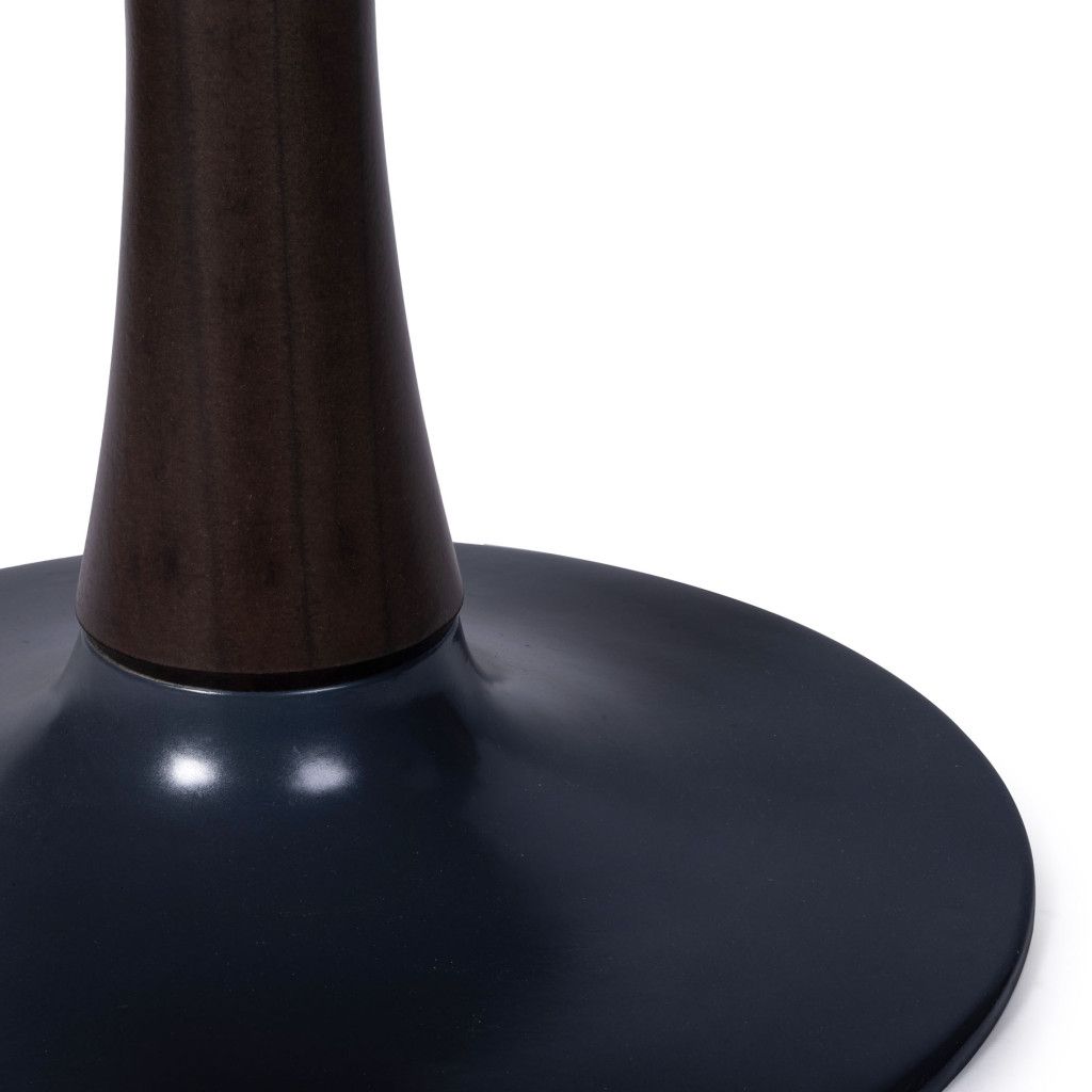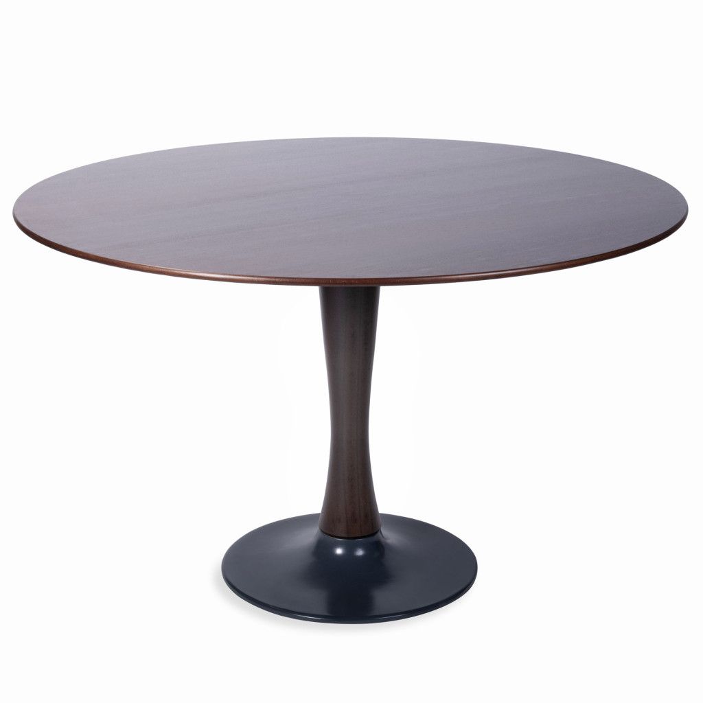 Dřevěný jídelní stůl vyrobený v 70. letech podnikem Dřevotvar Jablonné nad Orlicí. Výrobní družstvo Dřevotvar Jablonné nad Orlicí vyrábí nábytek již od roku 1951, kdy vzniklo spojením sedmnácti drobných řemeslníků a funguje dodnes. Stůl je vyroben z masivního bukového dřeva, stojí na tvarované dřevěné noze s kulatou kovovou základnou natřenou tmavě šedou barvou. Kruhová deska stolu je z MDF desky pokryté mahagonovou dýhou. Dřevo je mořeno do tmavě hnědého tónu v matném provedení. Stůl je ve skvělém stavu po kompletní renovaci v naší dílně.