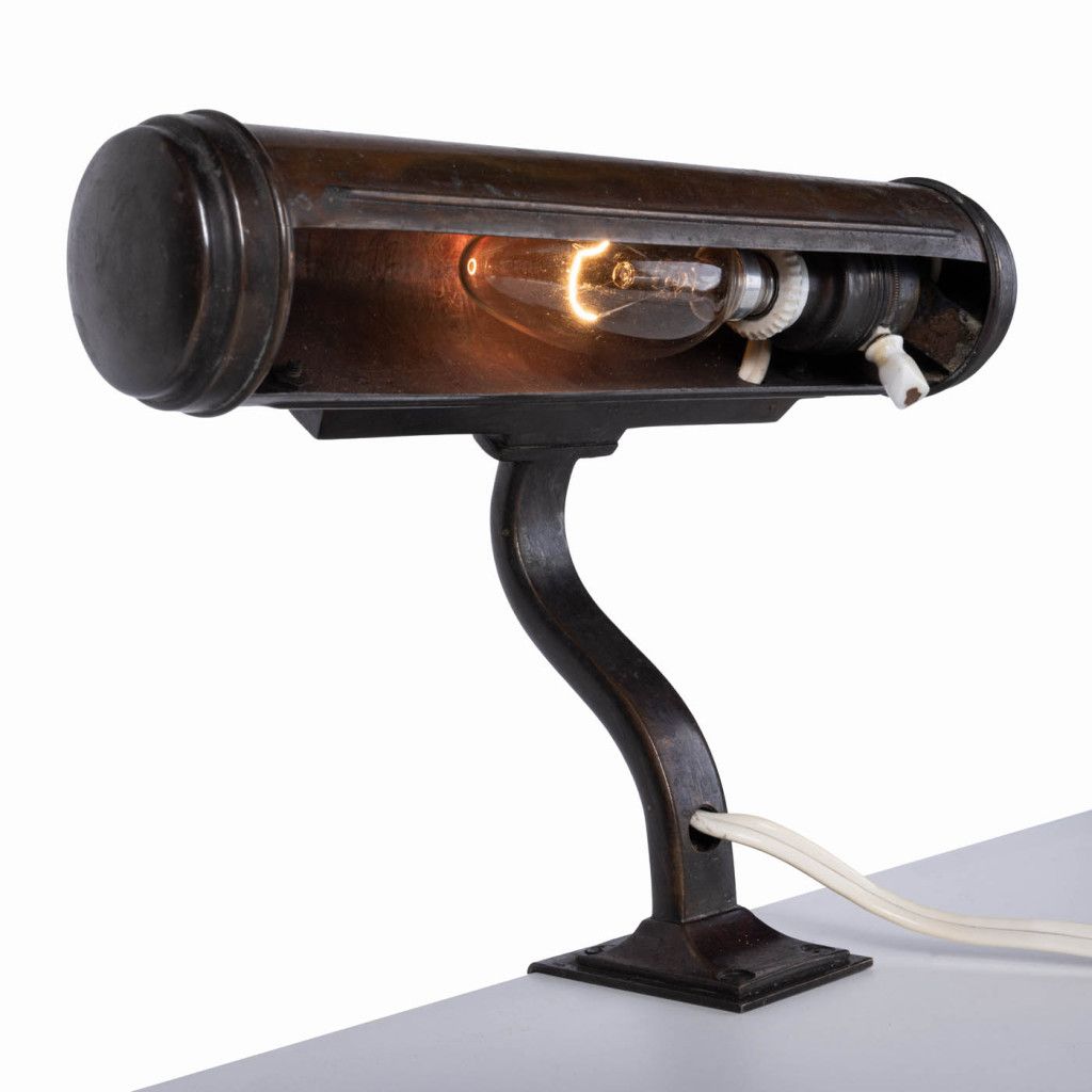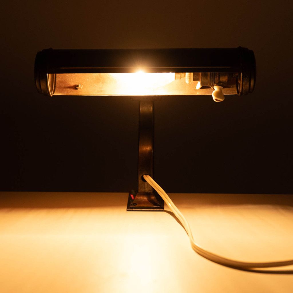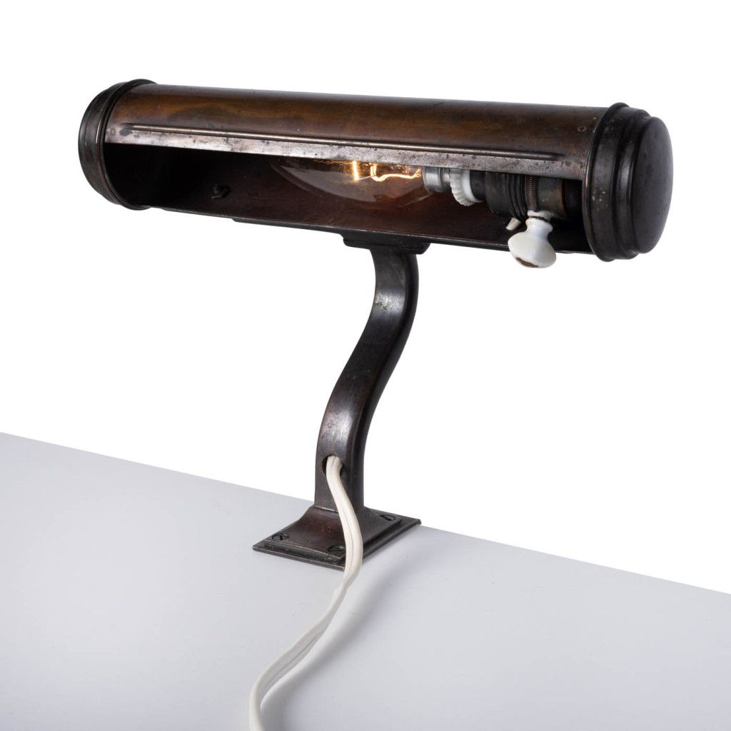 Mosazná lampička vyrobená pravděpodobně mezi 30. a 50. lety sloužila k osvětlení not, knih nebo pracovního stolu. Lampička má válcovité stínidlo a prohnutou nohu se svěrkou k přichycení k okraji desky. Má původní porcelánovou objímku a otočný vypínač. Je plně funkční a v dobrém původním stavu. Má výraznou patinu, mosaz je na většině plochy zoxidovaná. Svítí na jednu žárovku se závitem E14.