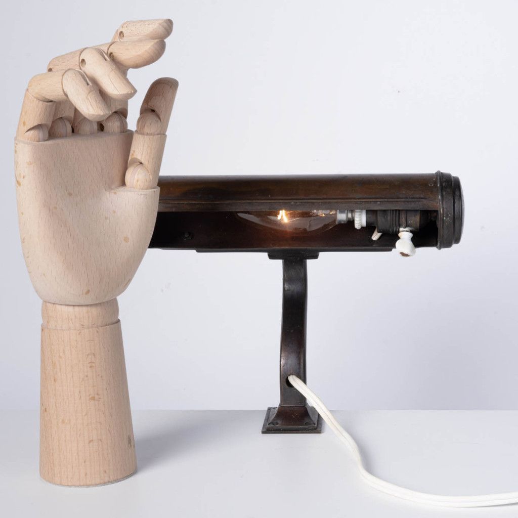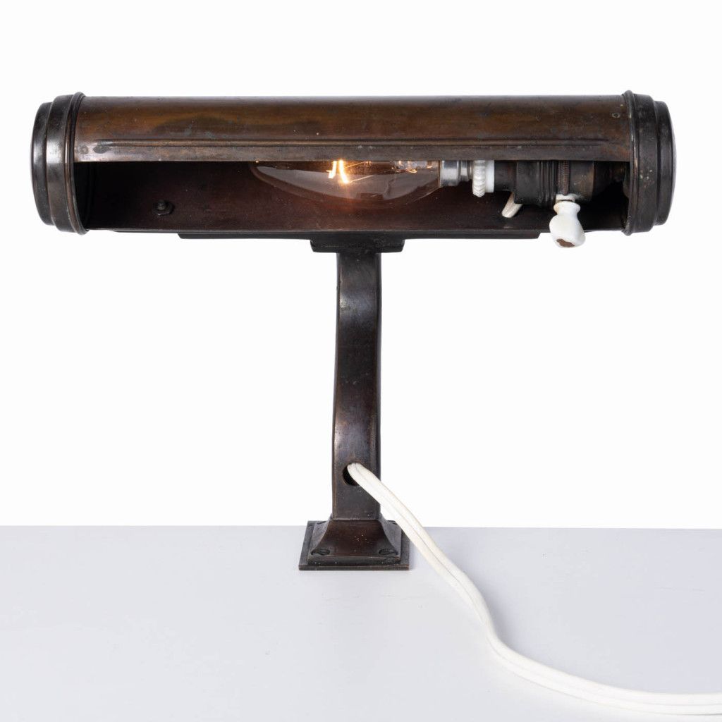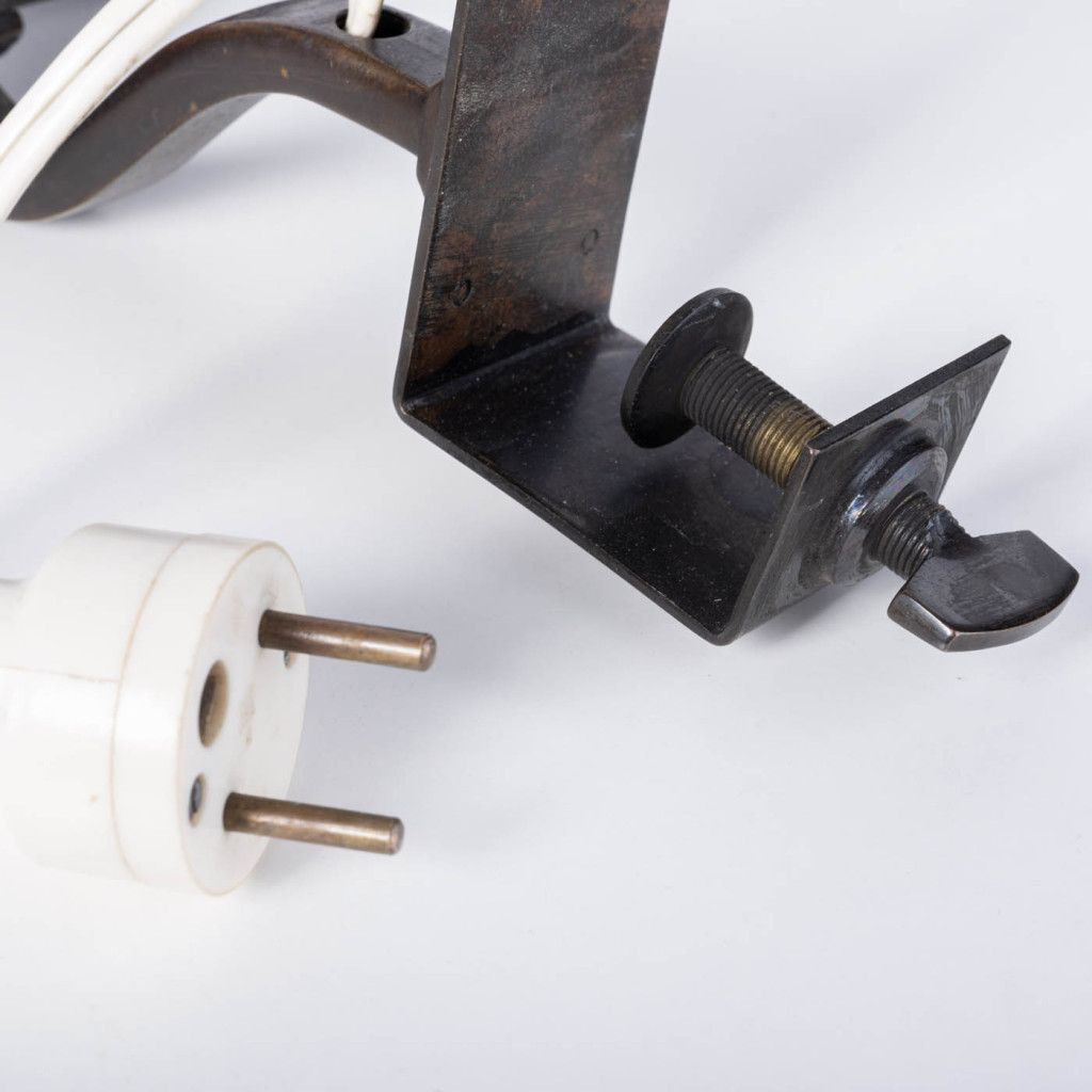 Mosazná lampička vyrobená pravděpodobně mezi 30. a 50. lety sloužila k osvětlení not, knih nebo pracovního stolu. Lampička má válcovité stínidlo a prohnutou nohu se svěrkou k přichycení k okraji desky. Má původní porcelánovou objímku a otočný vypínač. Je plně funkční a v dobrém původním stavu. Má výraznou patinu, mosaz je na většině plochy zoxidovaná. Svítí na jednu žárovku se závitem E14.