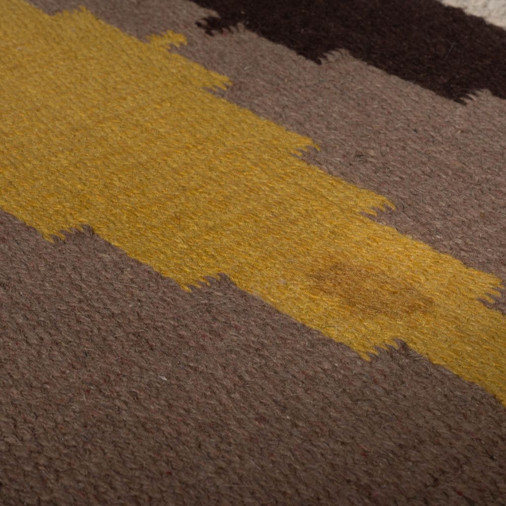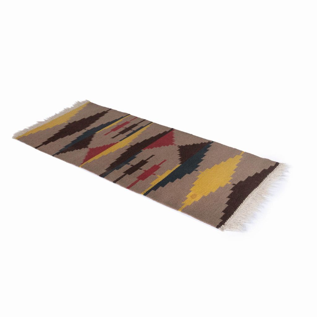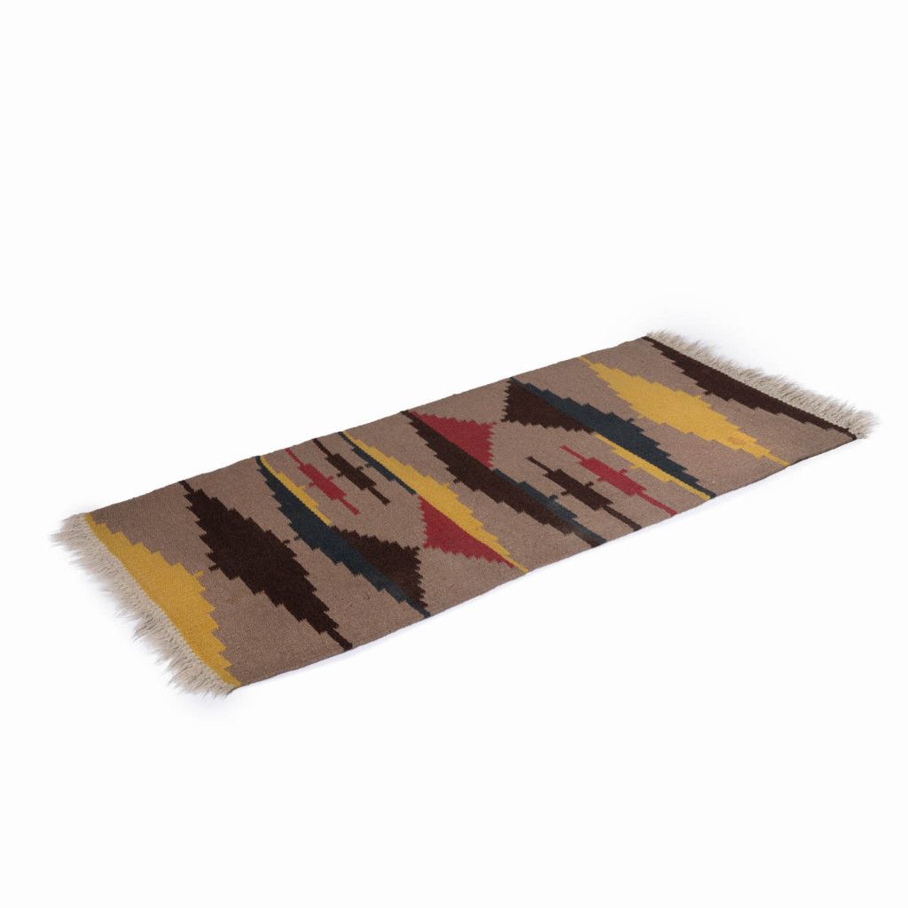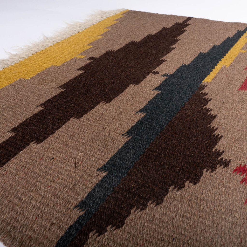 Tkaný vlněný koberec kelim s geometrickými vzory v zemitých barvách ze 60. let. Koberce kelim (často nazývané také kilim) jsou ploše tkané koberce, které vycházejí z tradic nomádských národů, ve 20. století se však staly velmi populárními a začaly se vyrábět i průmyslově. Koberec je obdélníkového tvaru a zakončen třásněmi. Koberec je v dobrém původním stavu. Na jednom místě je viditelná skvrna a třásně nemají místy plnou délku. Koberec byl důkladně vyčištěn, nikoli chemicky.