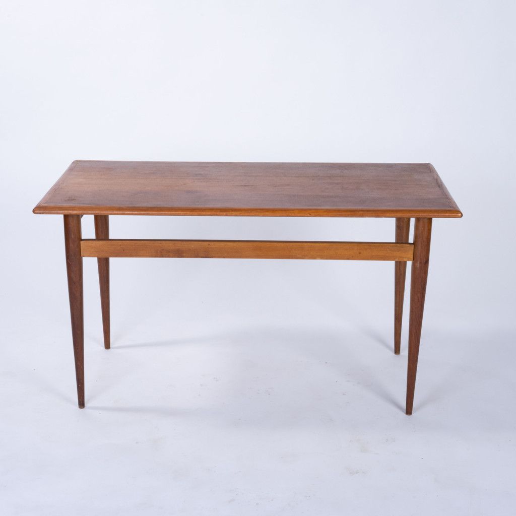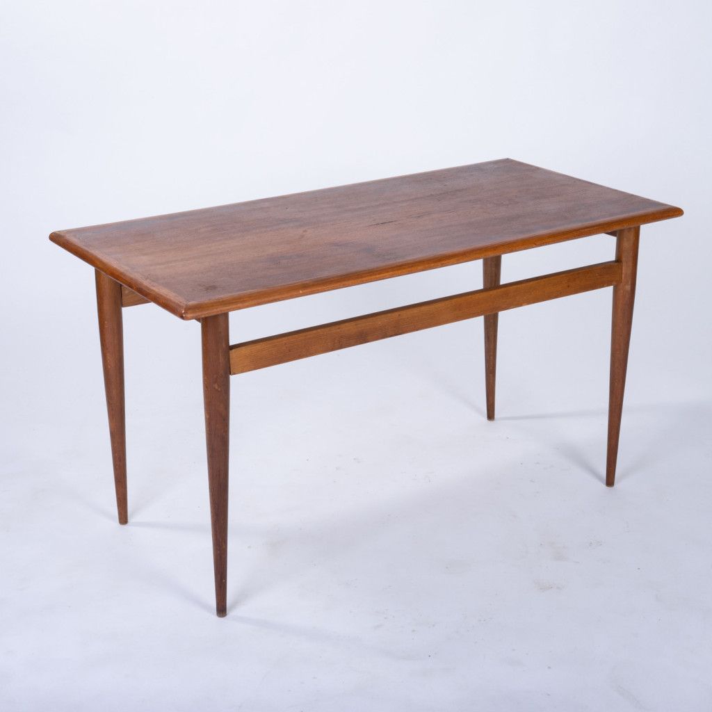 Lehký konferenční stolek s deskou z mahagonové dýhy a podnoží z bukového dřeva. Má pevnou konstrukci a krásnou kresbu dřeva. Povrch má jemnou, přirozenou patinu.