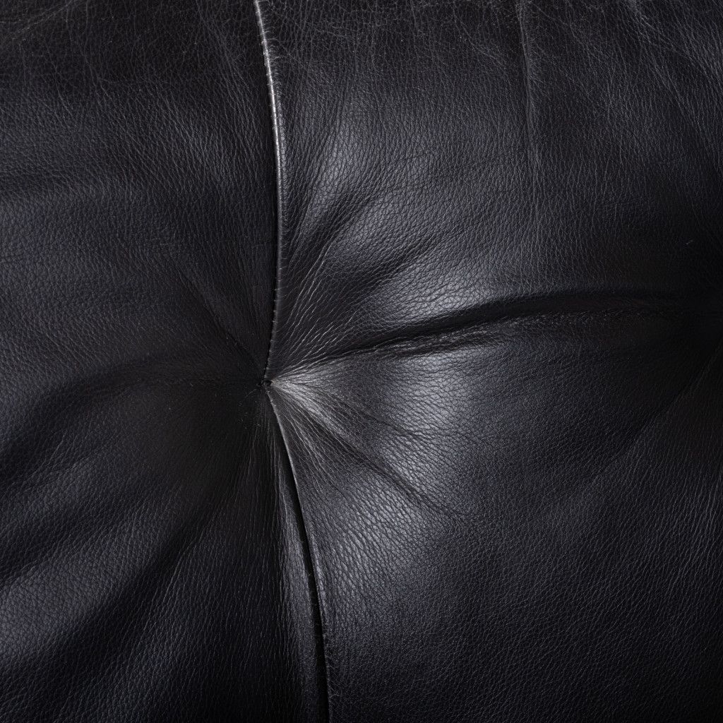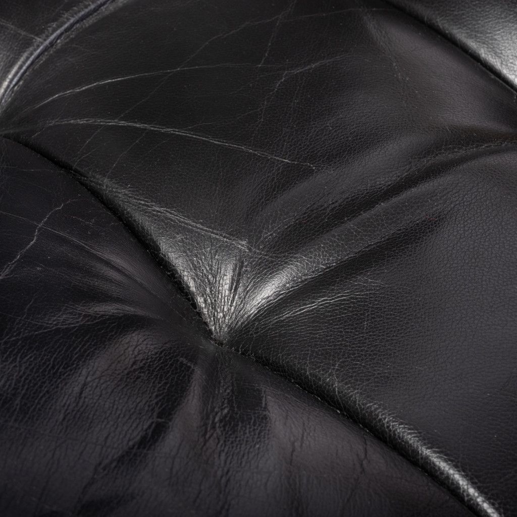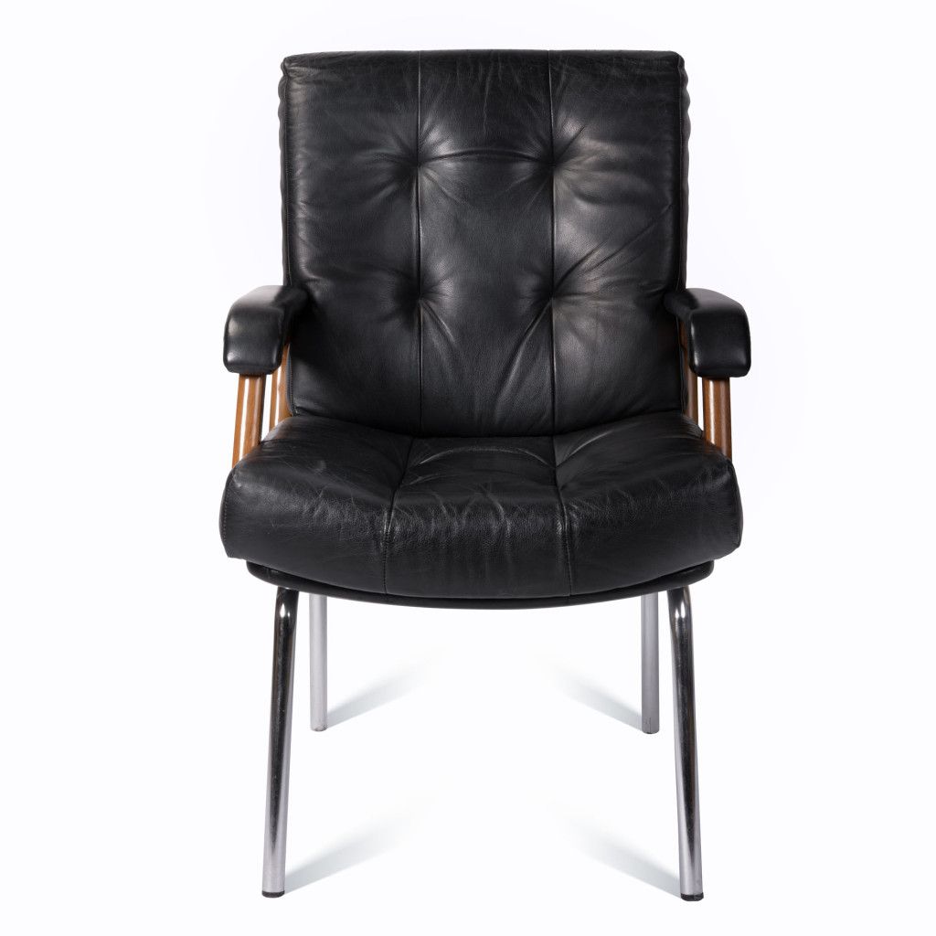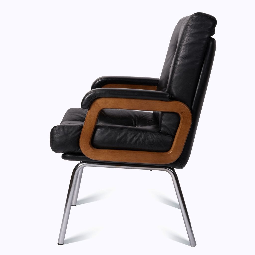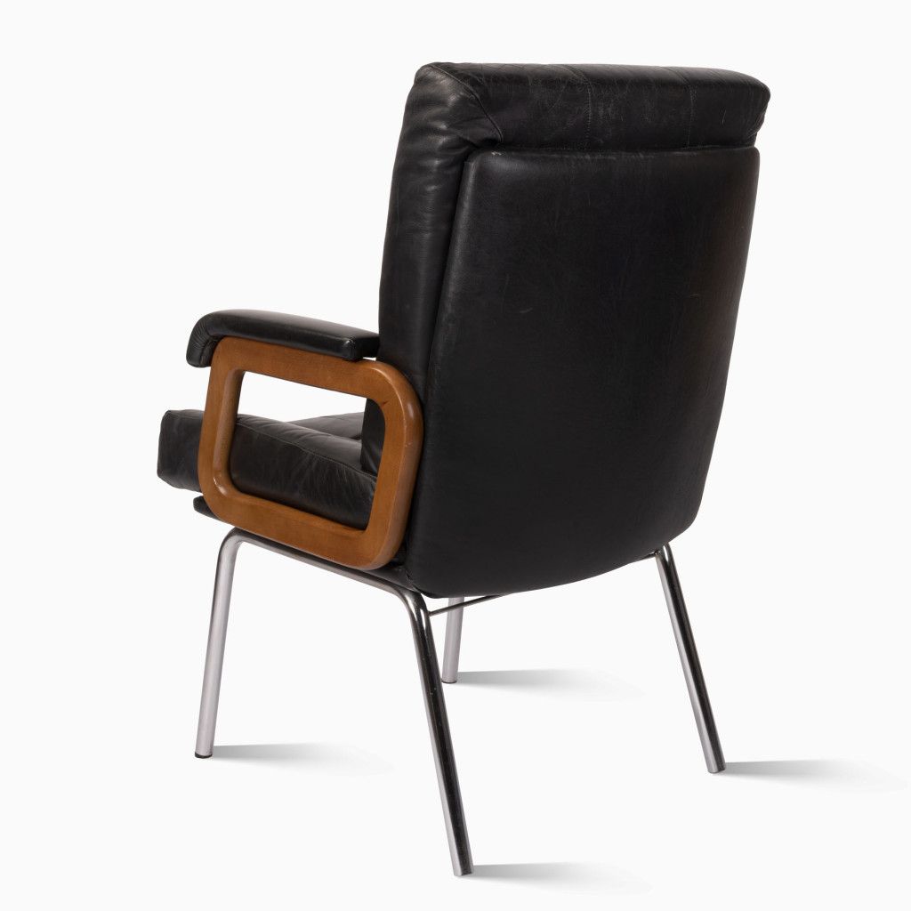 Kožené kancelářské křeslo s kovovou podnoží pochází pravděpodobně ze 70. let. Křeslo je velmi pohodlné, má měkké polstrování s prošíváním čalouněné kvalitní černou kůží. Stojí na čtyřech tenkých trubkových nožkách z chromované oceli. Obdélníkové područky z ohýbaného lakovaného buku jsou mořené do světle hnědého odstínu v lesklém provedení a kryté kůží. Je v dobrém původním stavu, kůže je mírně opotřebená, jak je vidět na fotografiích.
