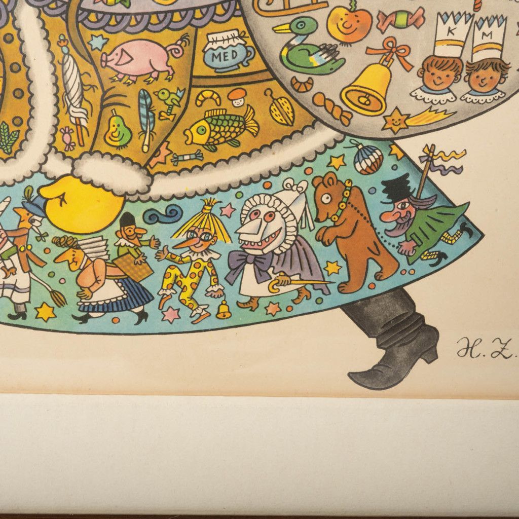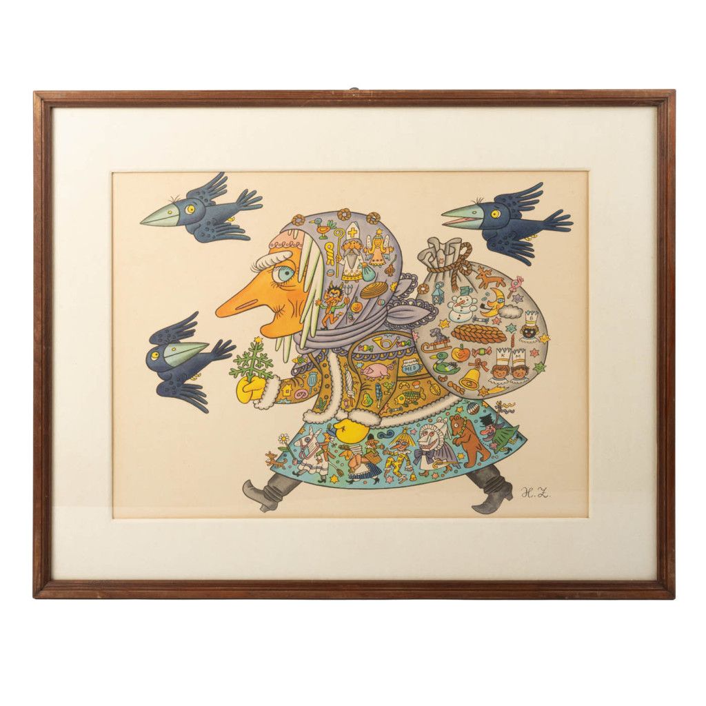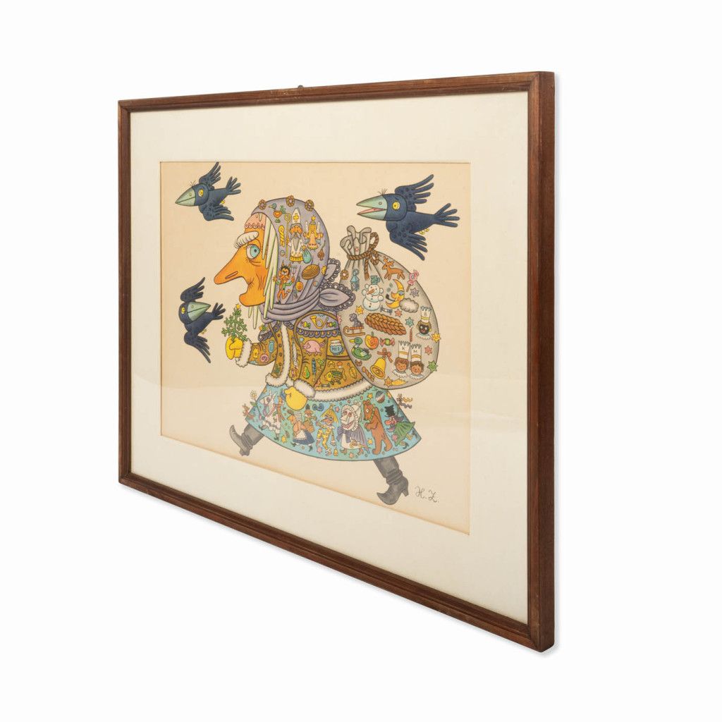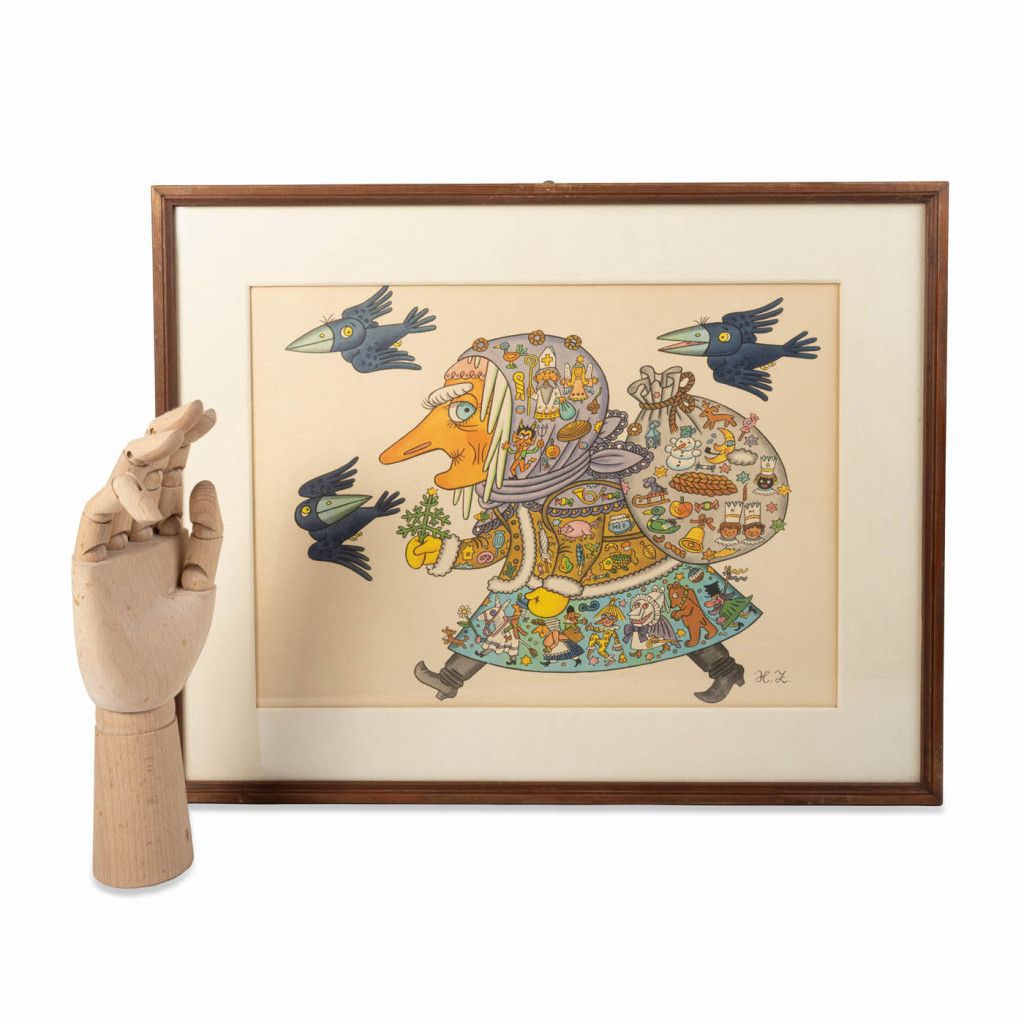 Originální grafika stařenky jako alegorie zimy od Heleny Zmatlíkové z roku 1968. Zima tvoří součást obrázkového cyklu čtyř ročních období, které také najdete v naší nabídce. Tisk je zasklený v hnědém dřevěném rámu s krémovou paspartou a poutkem na zavěšení. Je ve velmi dobrém původním stavu. Rám je pouze mírně odřený a vzadu má drobné stopy od vody.