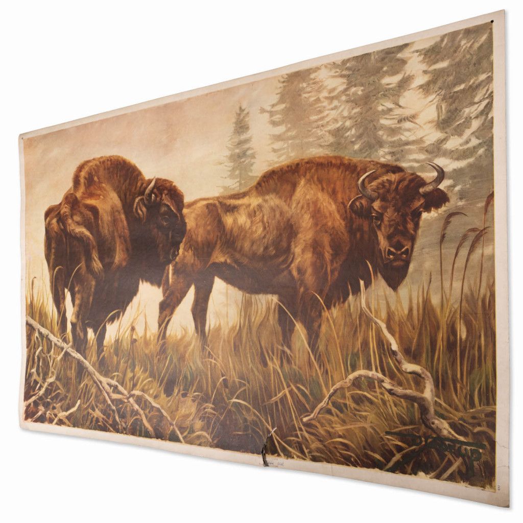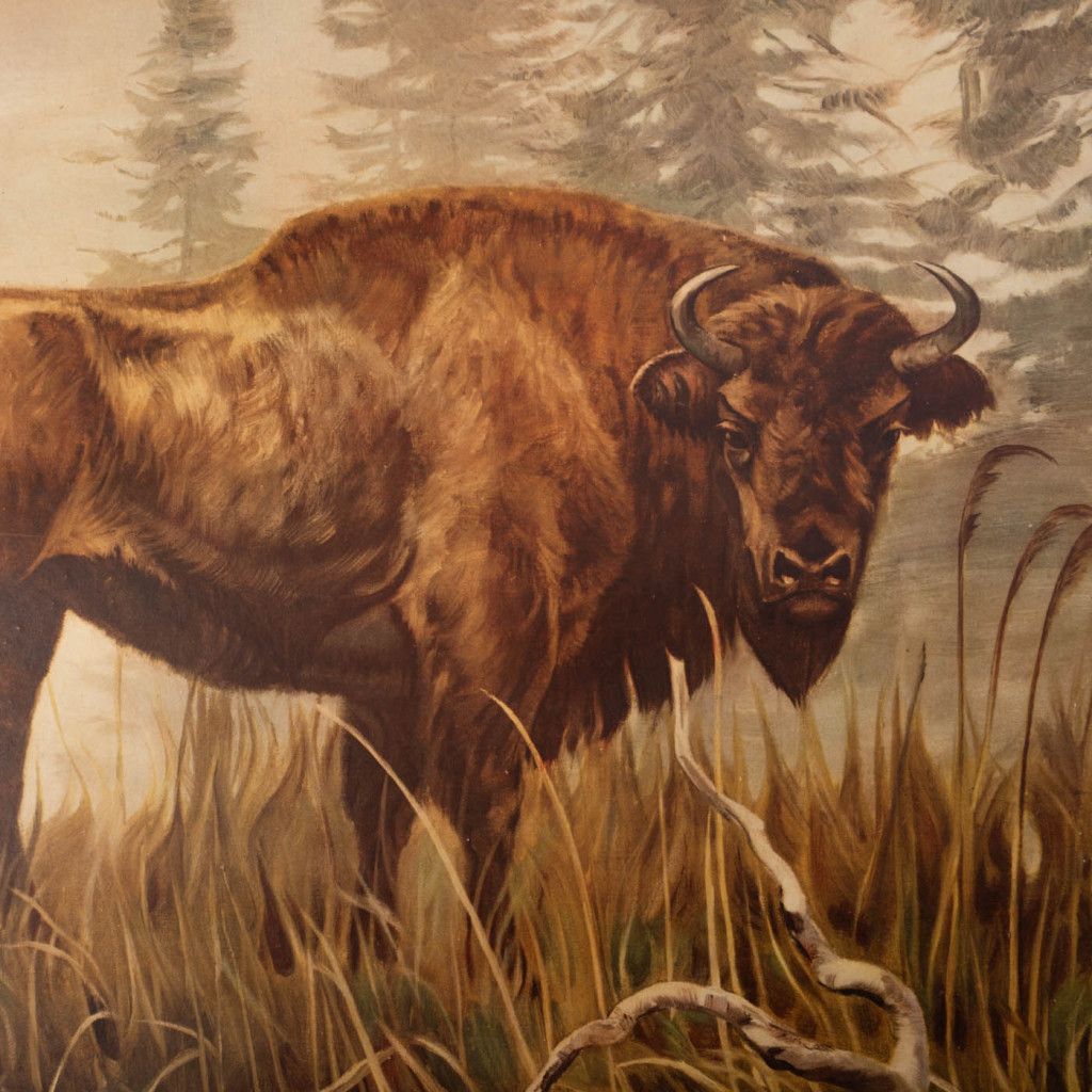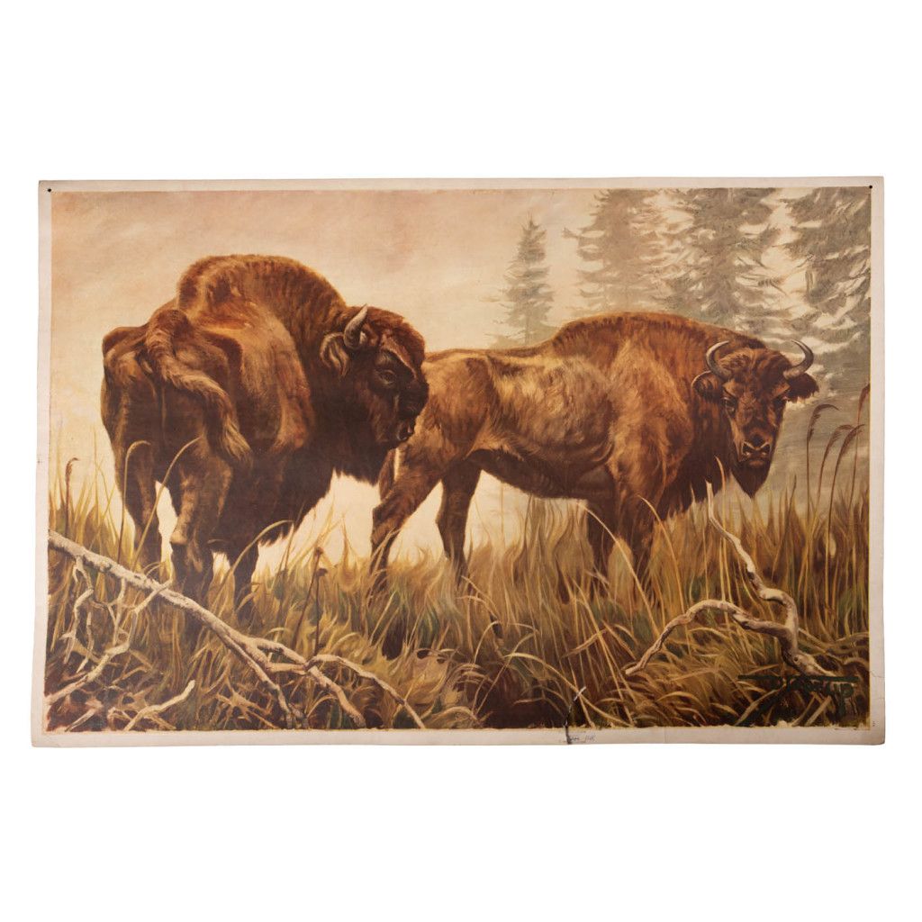Krásný prvorepublikový školní plakát zobrazující dva zubry evropské neboli Bison bonasus na travnaté pláni. Jde o kolorovaný tisk z roku 1933 a pochází ze série České zoologické obrazy od malíře Janeze Mihaela Gorupa. Plakát je tištěný na tvrdém papíře. Je ve velmi dobrém původním stavu, papír je v jednom místě na spodní straně natržený.