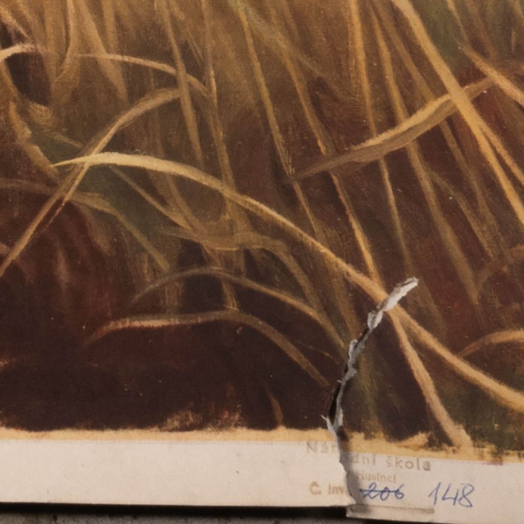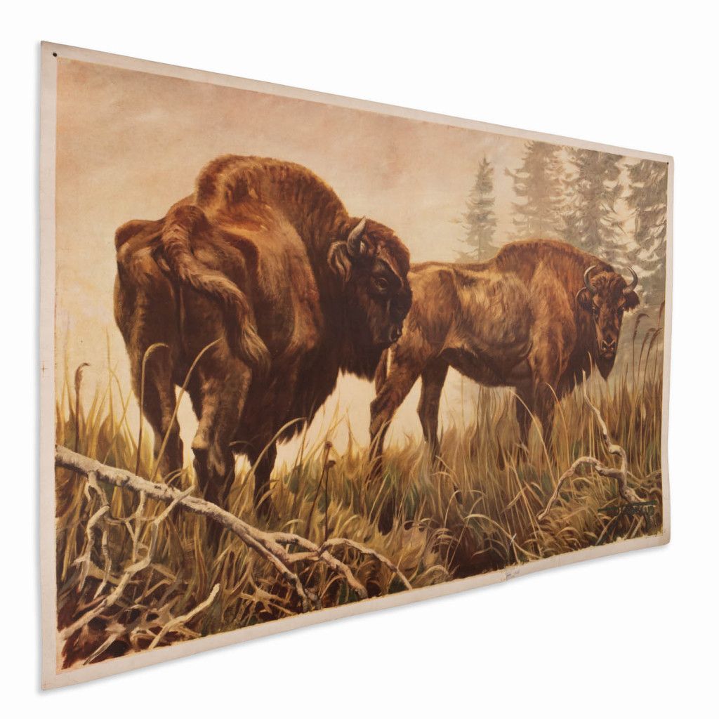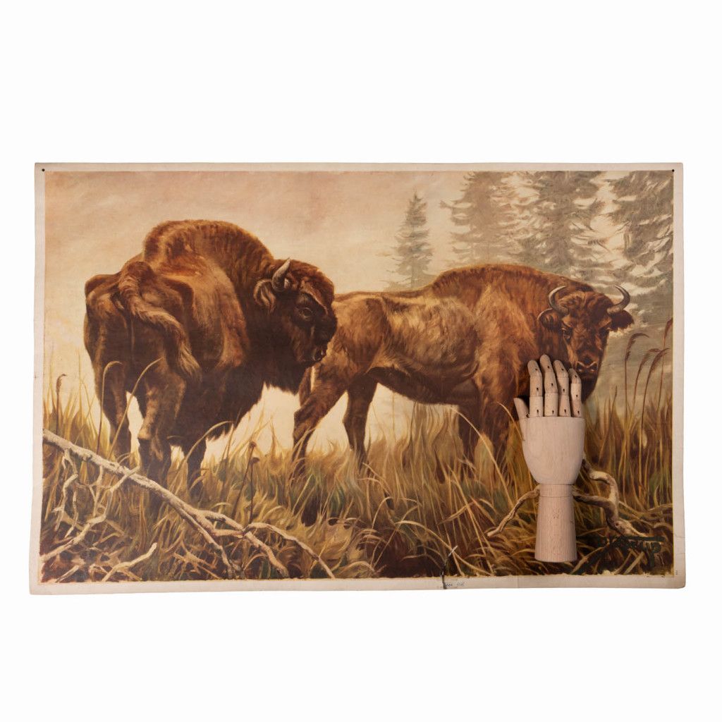 Krásný prvorepublikový školní plakát zobrazující dva zubry evropské neboli Bison bonasus na travnaté pláni. Jde o kolorovaný tisk z roku 1933 a pochází ze série České zoologické obrazy od malíře Janeze Mihaela Gorupa. Plakát je tištěný na tvrdém papíře. Je ve velmi dobrém původním stavu, papír je v jednom místě na spodní straně natržený.