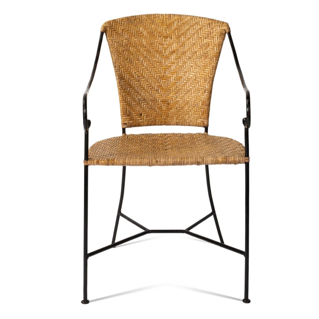 Křeslo vyplétané lakovaným ratanem s kovovou konstrukcí. Stojí na čtyřech tenkých černě lakovaných nožkách, které jsou ve spodní části propojeny. Křeslo má zajímavě kroucené područky a široký sedák a opěrák. Je v dobrém původním stavu s viditelnou patinou. Lak ratanu se místy odlupuje a dřevo jemně třepí. Na několika místech pod černým lakem prosvítá původní červený lak.