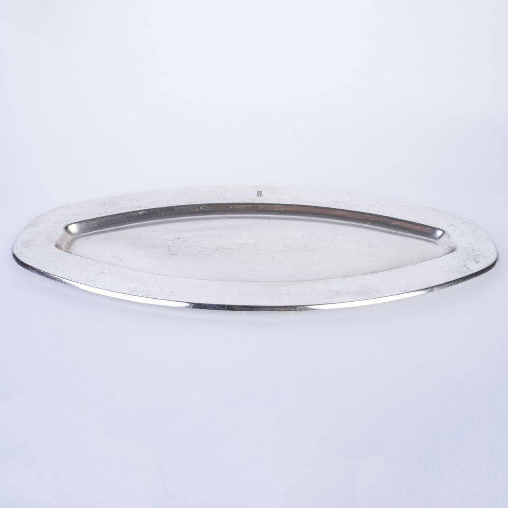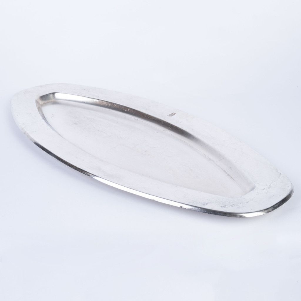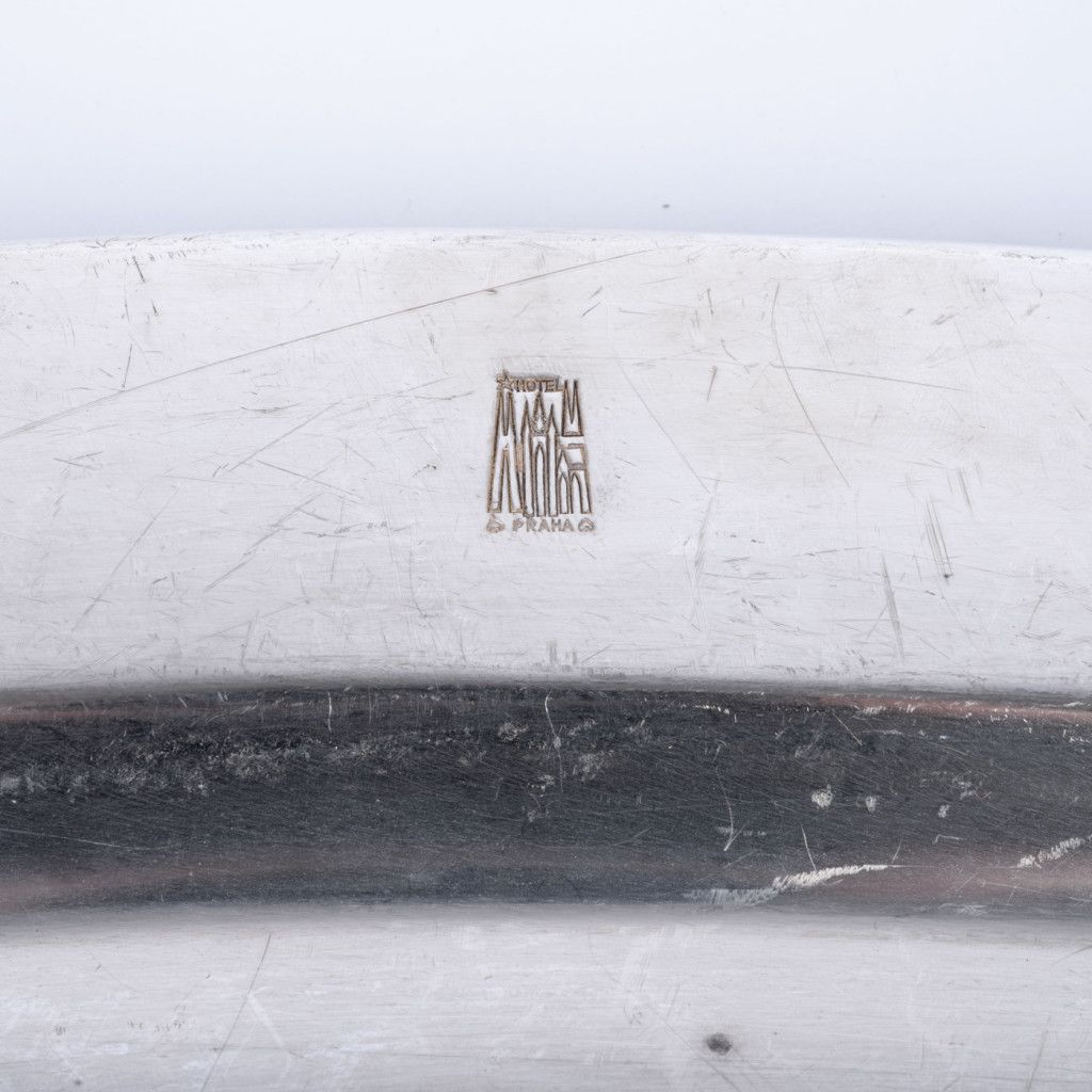 Hotel Praha byl naprostou špičkou mezi československými hotely. Šlo o nejluxusnější ubytovací zařízení postavené výhradně pro komunistickou stranu a její hosty a běžní obyvatelé do něj neměli přístup. Nám se podařilo při jeho bourání v roce 2014 zachránit několik jedinečných předmětů mezi které patří i tento tác na ryby, vyrobený z bílé postříbřené mosazi (alpaka). Fotka je ilustrační, každý kus má lehce odlišnou patinu. Z důvodu stáří je každý kus na povrchu poničen poškrábáním, či korozí. Tác byl důkladně vyčištěn.