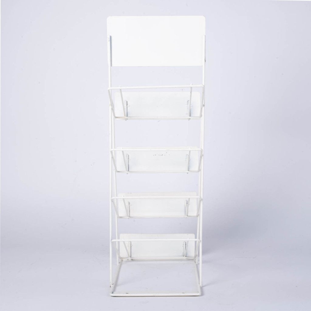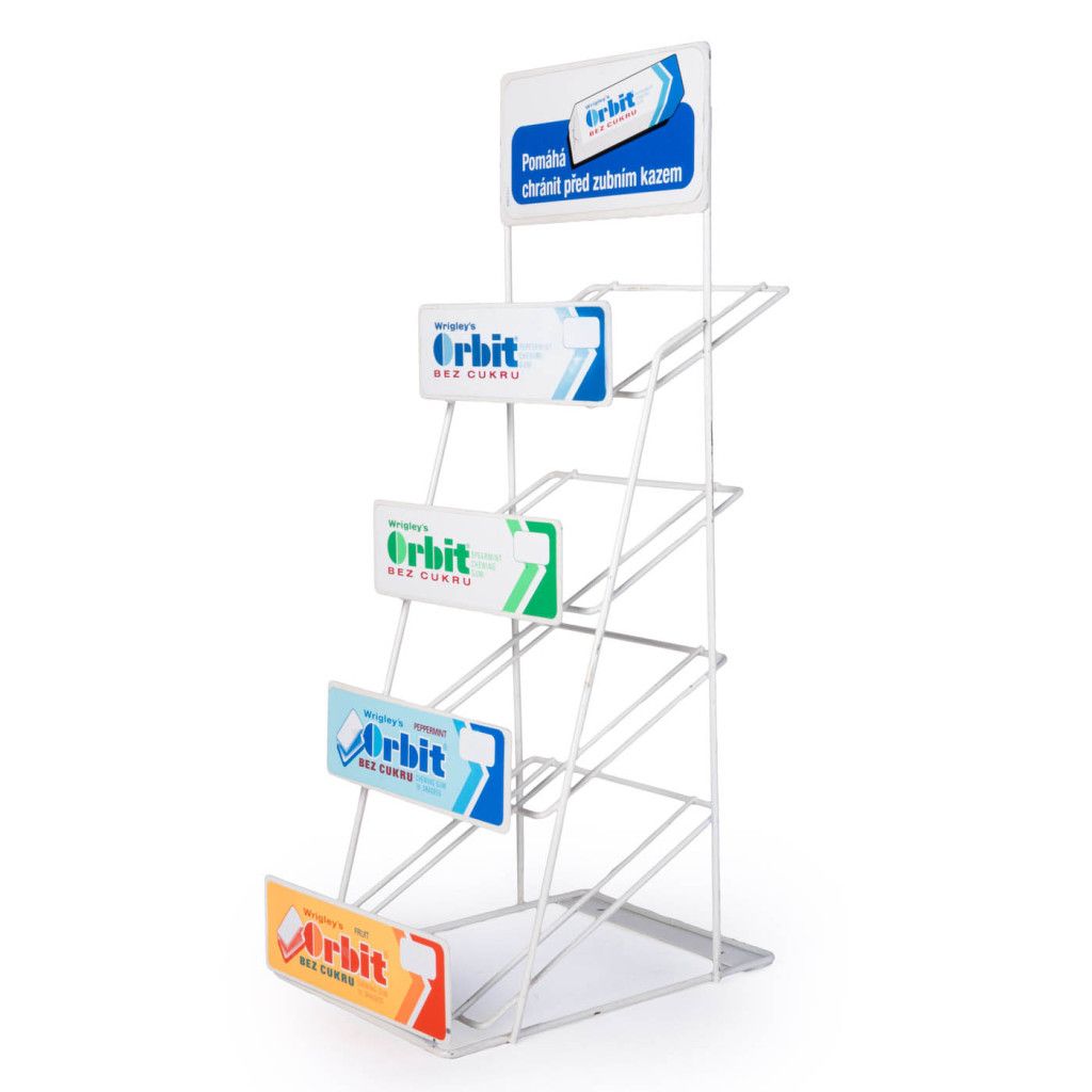 Stojan má bíle lakovanou kovovou konstrukci se čtyřmi úrovněmi přihrádek na různé druhy žvýkaček. Je ve velmi dobrém původním stavu, místy je konstrukce lehce odřená, jak je vidět na fotografiích.