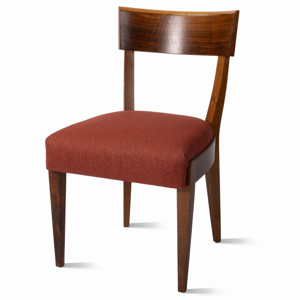 Dřevěná jídelní židle vyrobená ve 40. letech podnikem UP závody podle návrhu Jindřicha Halabaly. Opěradlo je vyrobeno z ořechového masivu, ostatní části jsou z bukového dřeva a potažené ořechovou dýhou. Dřevo má výraznou dřevokresbu a je mořeno do sytě hnědého odstínu. Původní pružinová konstrukce sedáku je nově čalouněna světle červenou látkou. Židle je ve výborném stavu po kompletní renovaci v naší dílně.