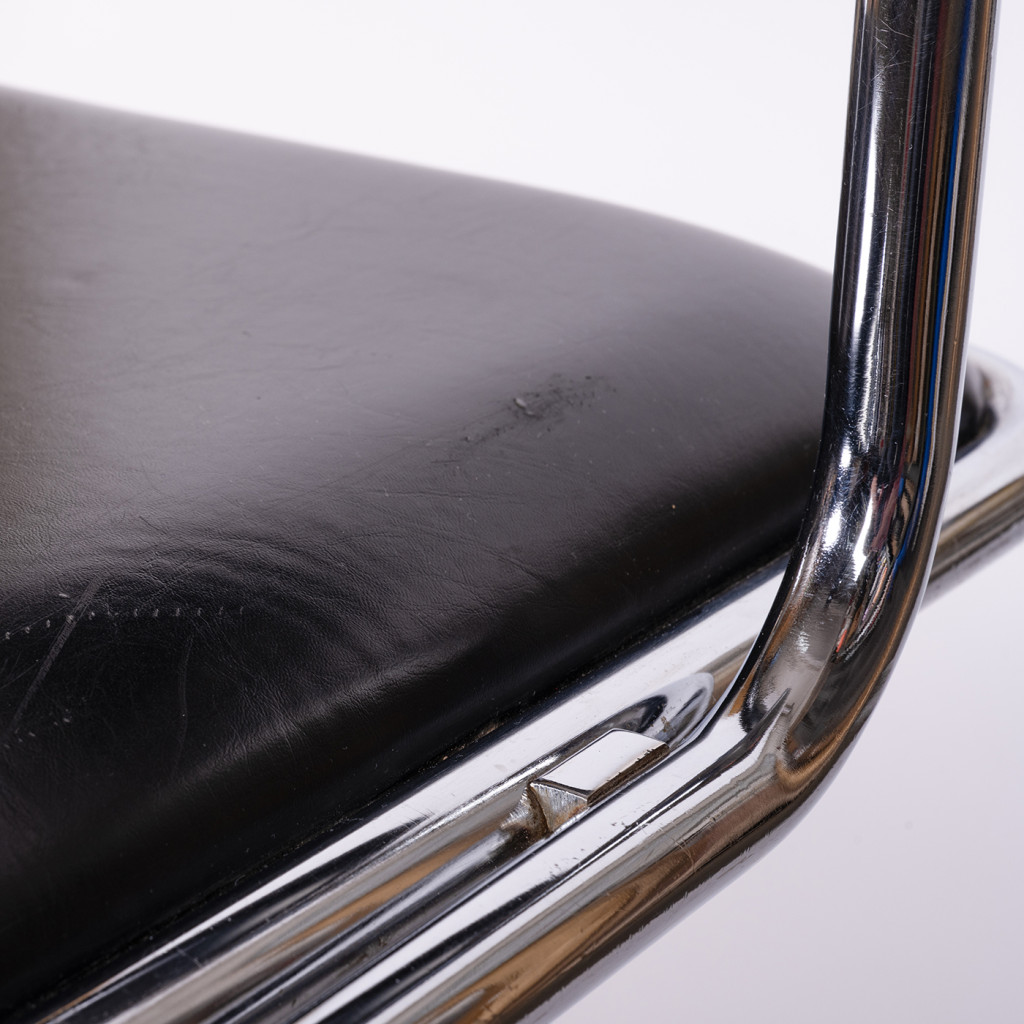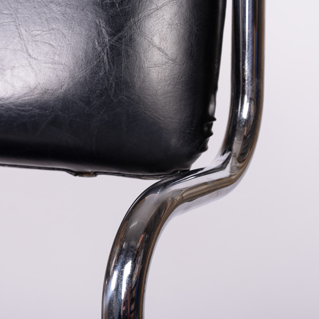 Židle má konstrukci z ohýbané ocelové chromované trubky, sedák i opěrák mají překližkový základ, jsou polstrované a potažené černou koženkou. Židle je ve velmi dobrém původním stavu. Koženka je místy lehce natržená a chromování odřené, jak je patrné z fotek.